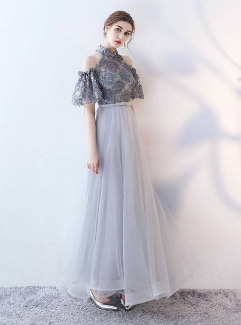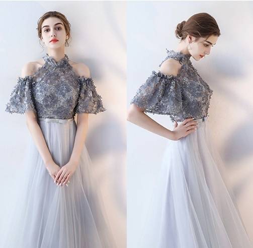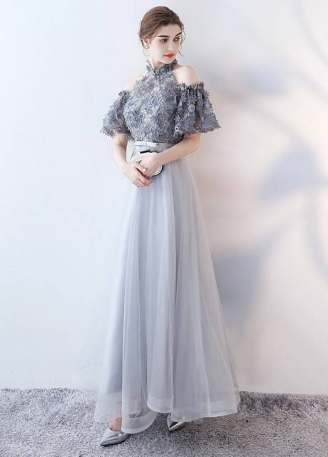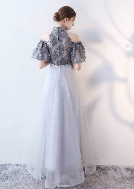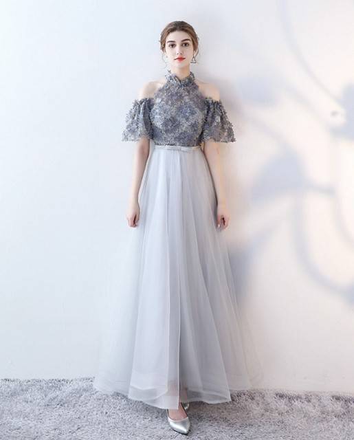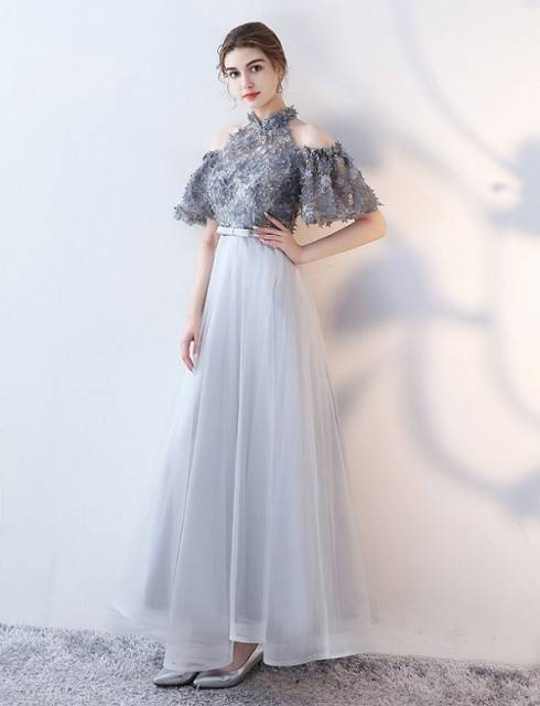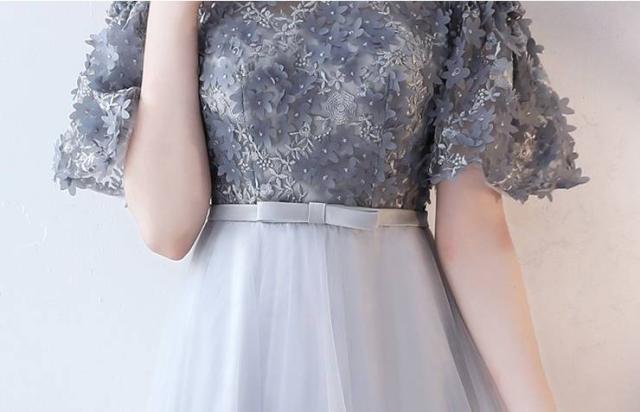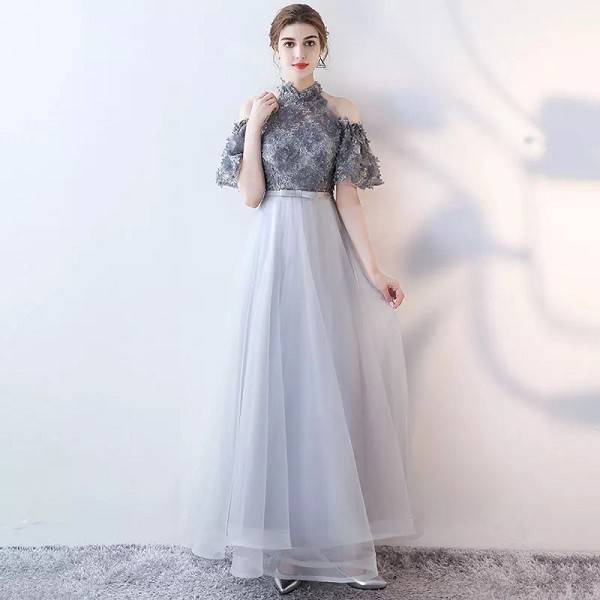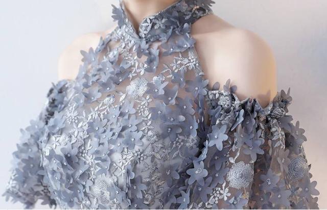 ロングドレス 演奏会 パーティドレス 二次会 謝恩会 大きいサイズ ゆったり大きいサイズ ロング丈 袖あり 半袖 刺繍 着痩せ 個性的 花柄 レース 20代 30代 春 夏 フェミニン ガーリー エレガント チュール 透け感 オフショルダー グレー リボン 背中 セクシー
