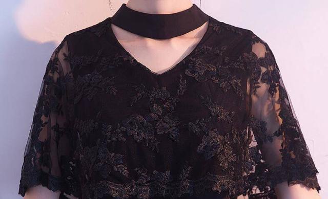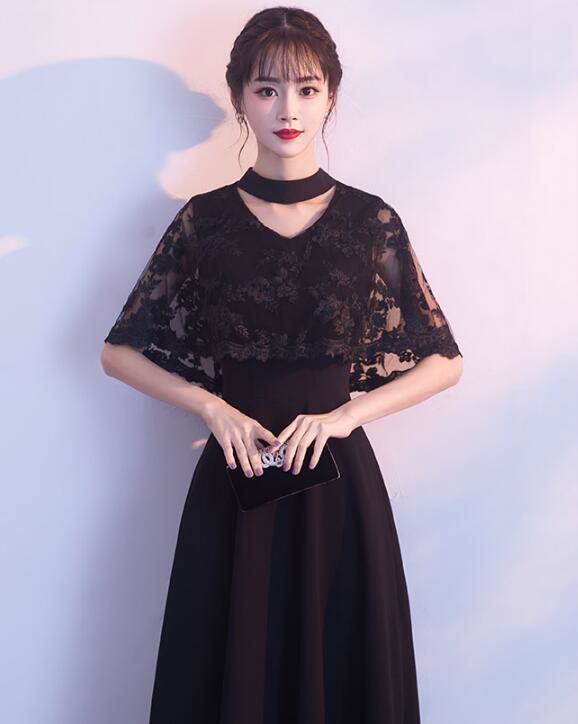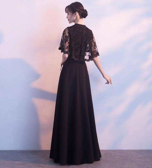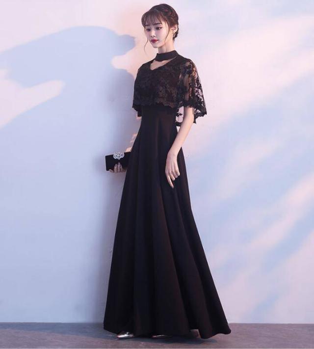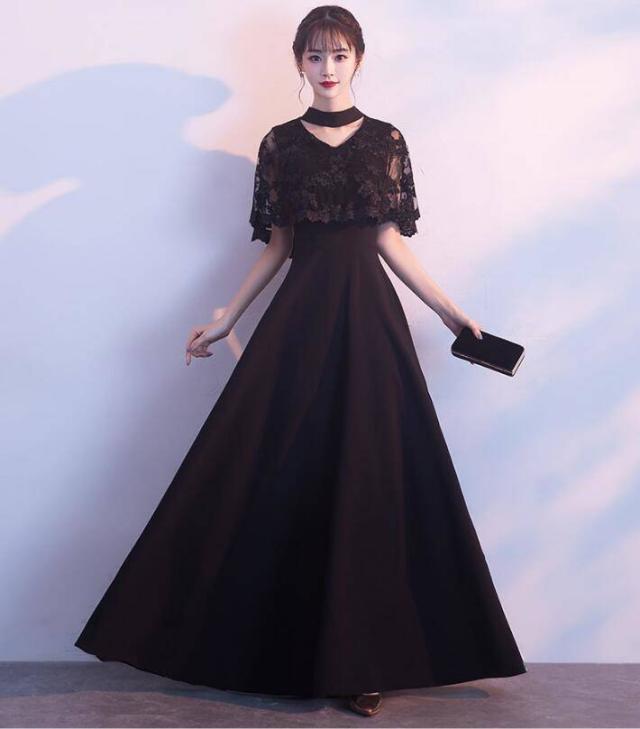 ロングドレス 黒 パーティードレス イブニングドレス 春夏 結婚式 二次会 披露宴 ブラック 大きいサイズ ロング丈 マキシ丈 ノースリーブ 半袖 袖付き Aライン フレア 刺繍 花柄 レース 透け感 シースルー ボレロ風 無地 Vネック チョーカー