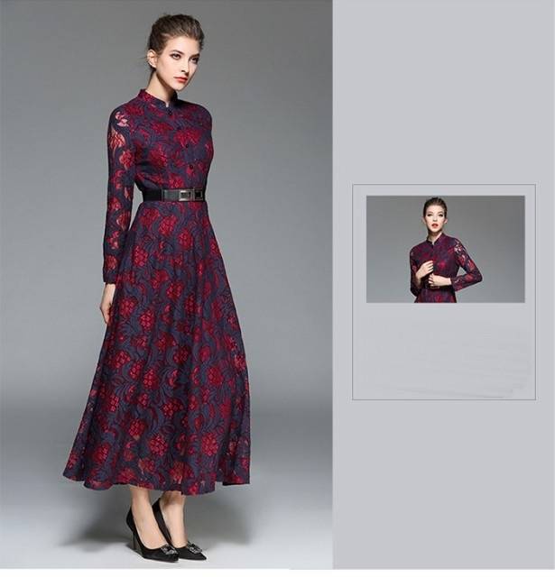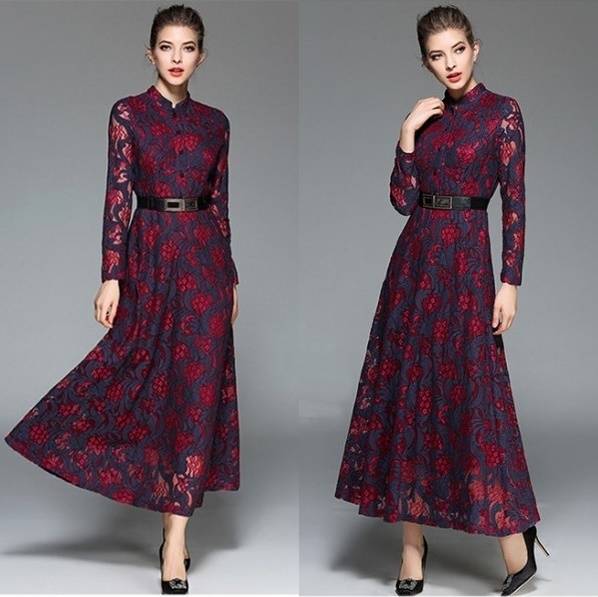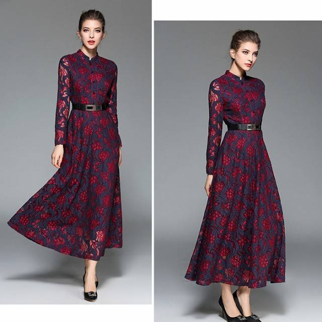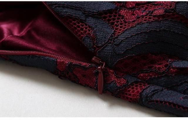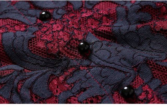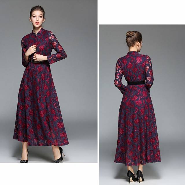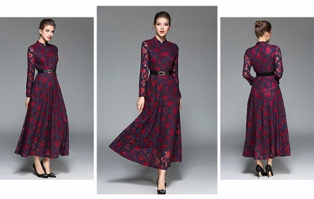 ワンピース レース 花柄 長袖 スタンドカラー ハイネック バイカラー ロング フレア Aライン フェミニン エレガント パーティー 女子会