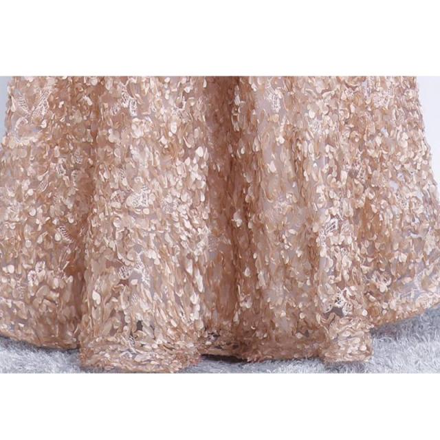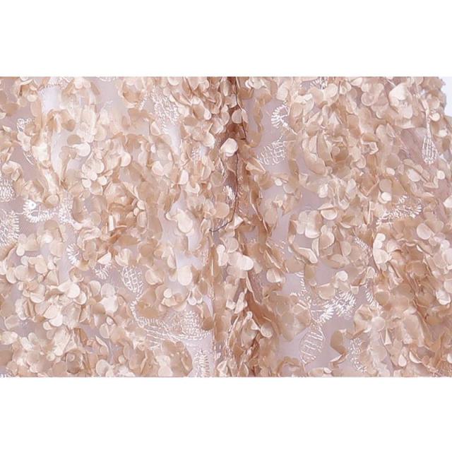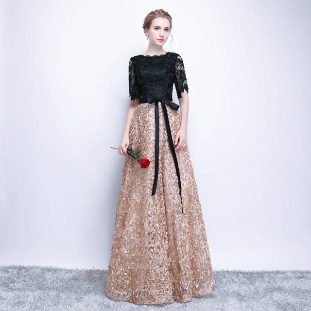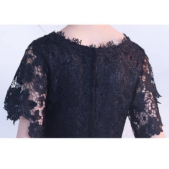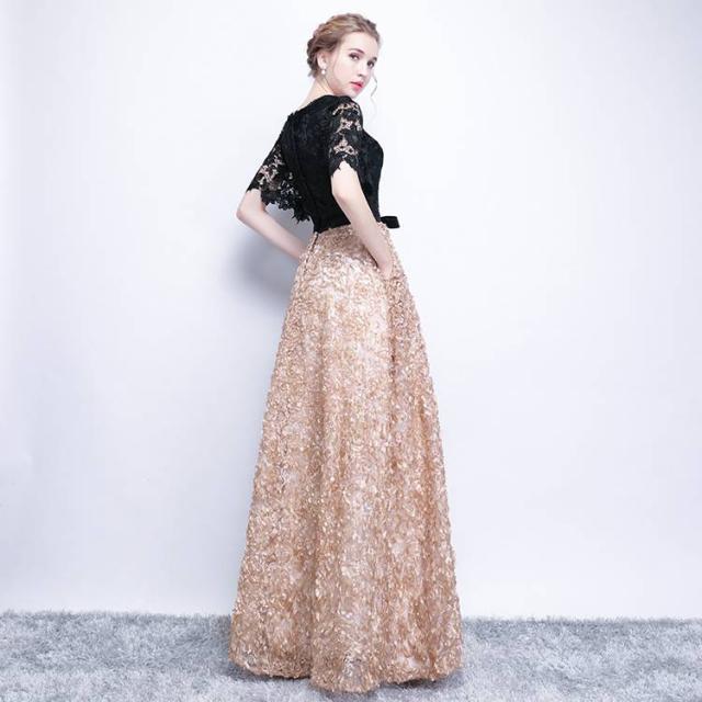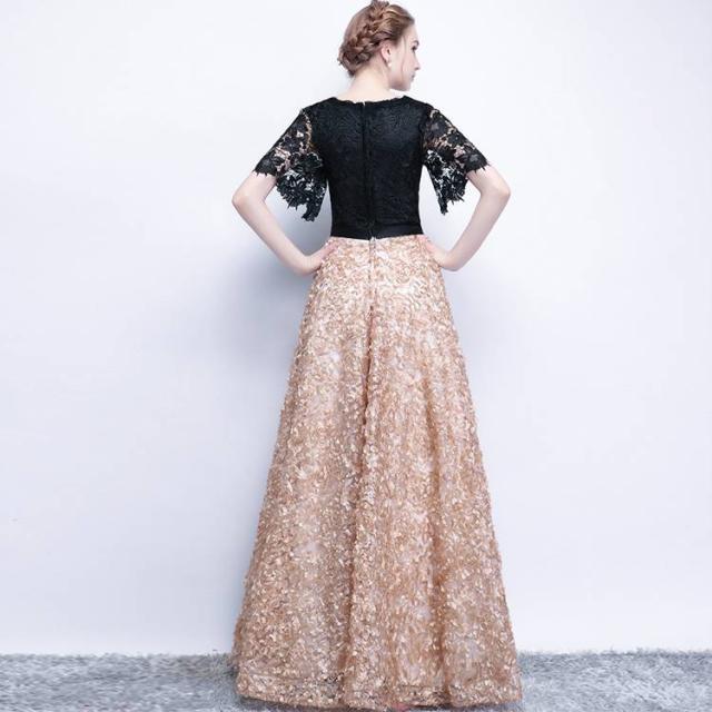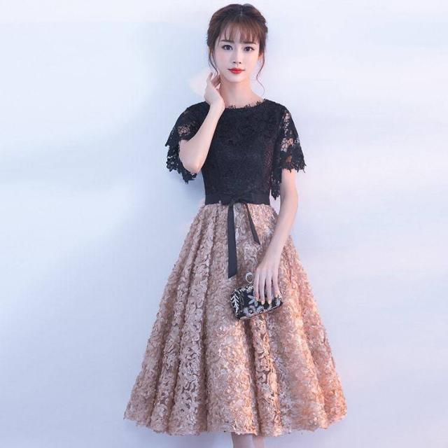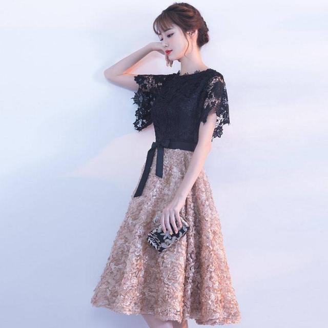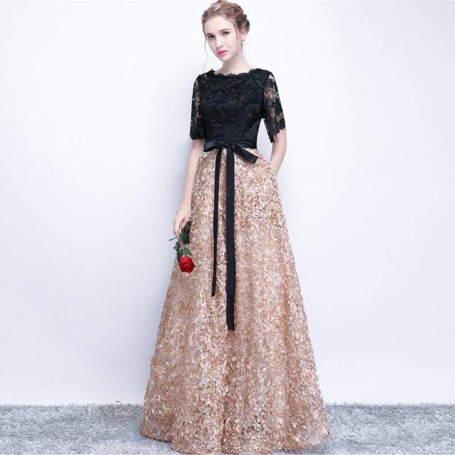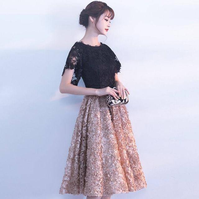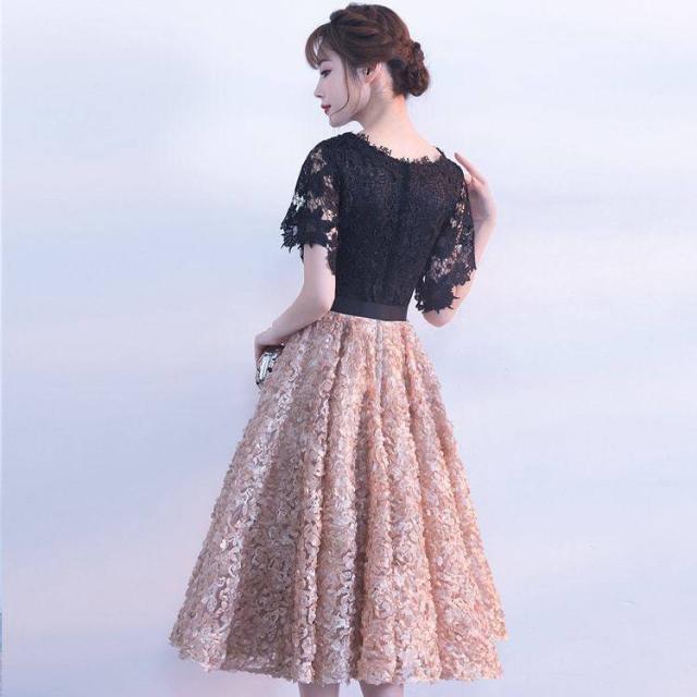 パーティードレス レース 花 モチーフ 結婚式 袖あり バイカラー 花柄 フレア Uネック ロング 半袖 ミモレ丈 レース レディース