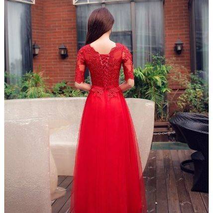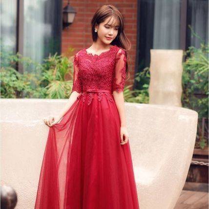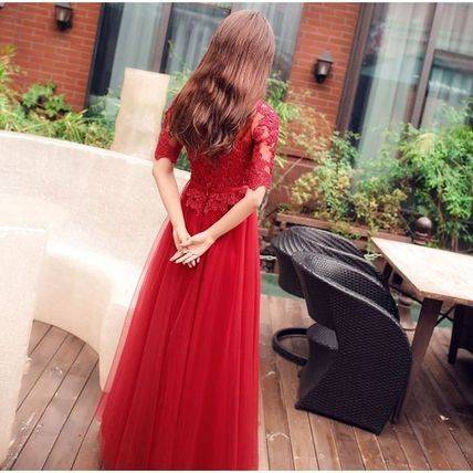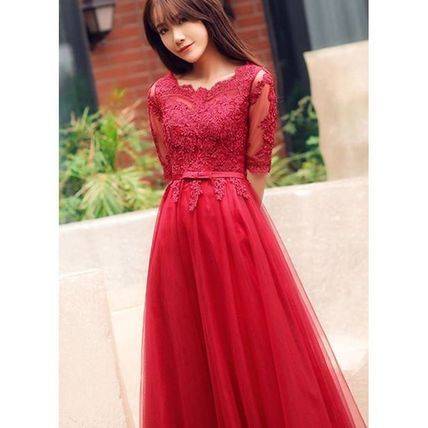 インポート ロングドレス 結婚式 二次会 レース パーティー 大人 クルーネック 花柄 七分丈 無地 ロング レディース 2018年新作