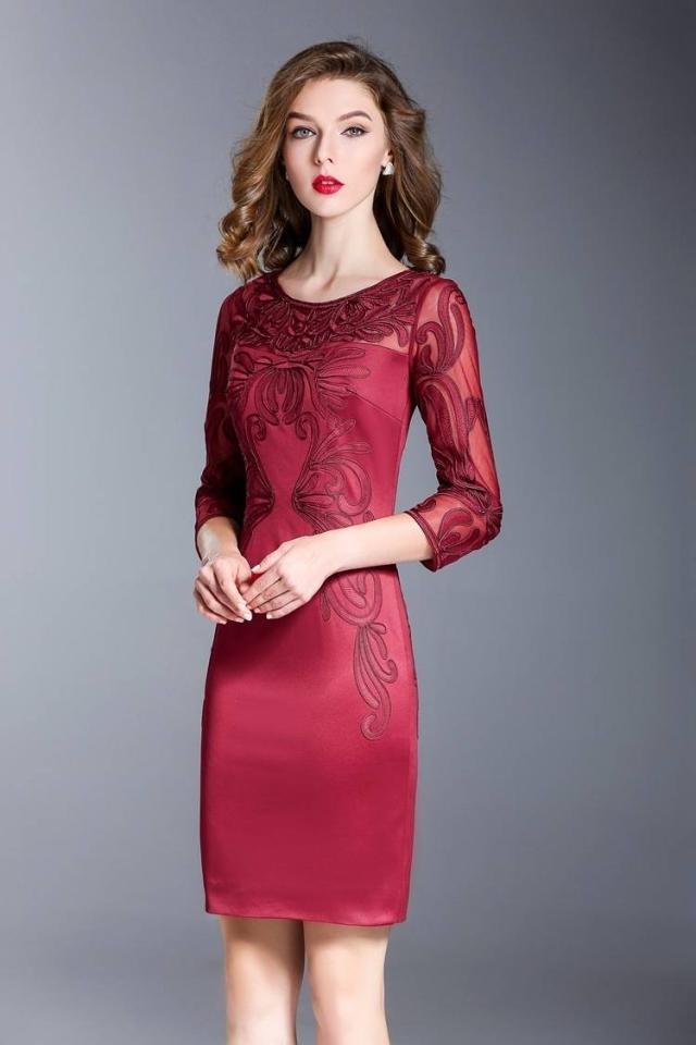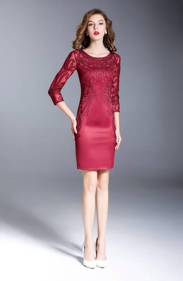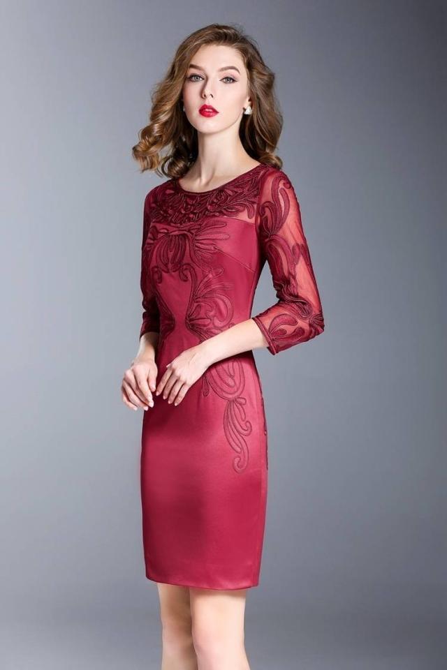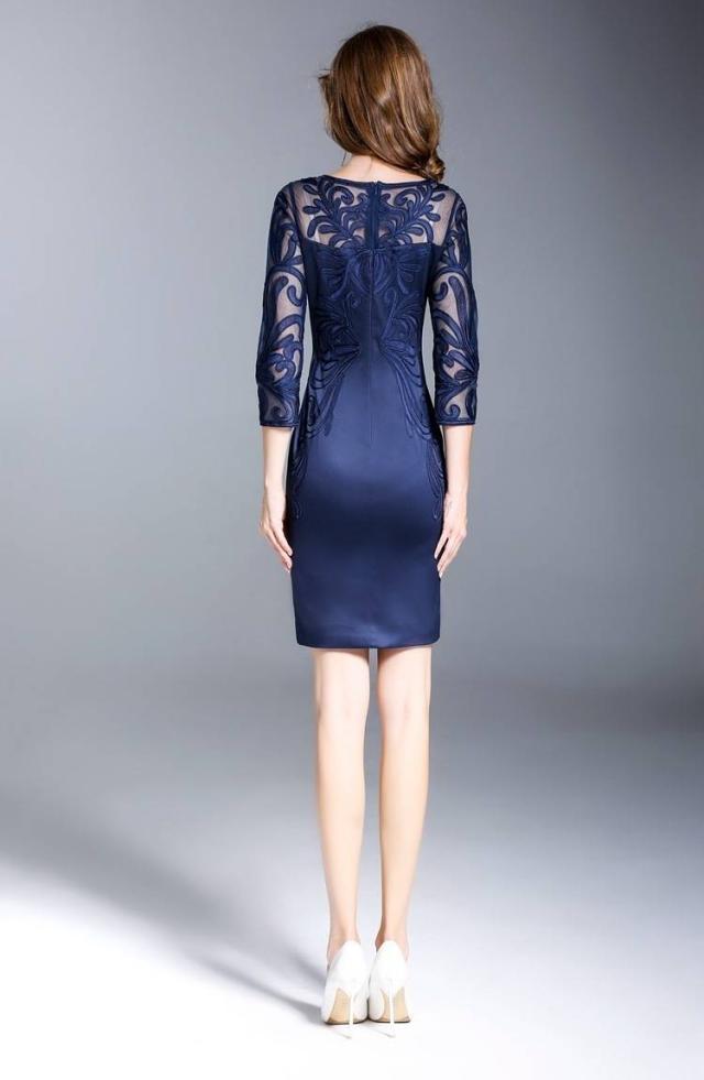 パーティードレス 刺繍 7分袖 タイト 2色 ラウンドネック タイト スリム ミニ丈 透け感 エレガント フェミニン パーティー 結婚式