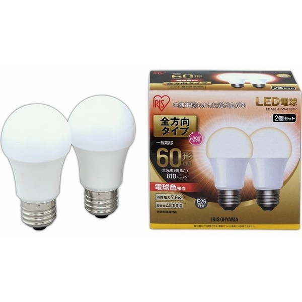 アイリスオーヤマ LDA8L-G/W-6T52P ECOHiLUX [LED電球(E26口金・60W相当・810lm・電球色)2個]
