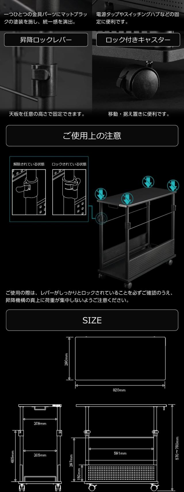 * 寸法:幅390mm×奥行き820mm×高さ570mm(570〜780mm)