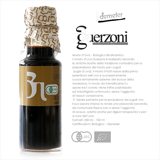 グエルゾーニ酢醸造所のもの。本物のバルサミコはイタリア北部のモデナ地方、またはレッジョ・エミリアでつくられています。このバルサミコの本場で、グエルゾーニ農園だけが「究極の有機栽培」と言われるバイオダイナミック農法を実践しています。ワインのぶどう作りで有名なこの農法、土地のパワー、植物の持つパワーを最大限に引き出すよう天体のリズムを取り入れながら、バルサミコ酢の原料となるぶどうを丁寧につくり続けています。こうやってできたぶどうを収穫後、搾った果汁を煮込み、同じく収穫したぶどうを発酵させてつくったワインビネガーを混ぜ合わせてできるバルサミコ酢。これを10年という長い年月をかけて樽の中で熟成させたものがバルサミコ酢10年熟成ゴールド!