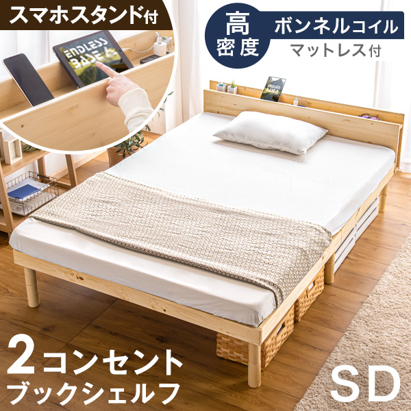 ベッド マットレス付 スマホスタンド&2口コンセント付き ベッド セミダブル マットレス付き 宮付き セミダブル すのこベッド ボンネルコイル マットレス付きベッド すのこベッド コンセント 2口 天然木 スノコベッド すのこ 宮 宮棚