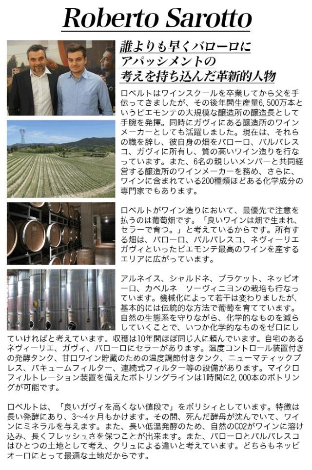 ![]() ロベルトはワインスクールを卒業してから父を手伝ってきましたが、その後年間生産量6,500万本というピエモンテの大規模な醸造所の醸造長として手腕を発揮。同時にガヴィにある醸造所のワインメーカーとしても活躍しました。現在は、それらの職を辞し、彼自身の畑をバローロ、バルバレスコ、ガヴィに所有し、質の高いワイン造りを行なっています。また、6名の親しいメンバーと共同経営する醸造所のワインメーカーを務め、さらに、ワインに含まれている200種類ほどある化学成分の専門家でもあります。ロベルトがワイン造りにおいて、最優先で注意を払うのは葡萄畑です。「良いワインは畑で生まれ、セラーで育つ。」と考えているからです。所有する畑は、バローロ、バルバレスコ、ネヴィーリエ、ガヴィといったピエモンテ最高のワインを産するエリアに広がっています。 ![]() アルネイス、シャルドネ、ブラケット、ネッビオーロ、カベルネ ソーヴィニヨンの栽培も行なっています。機械化によって若干は変わりましたが、基本的には伝統的な方法で葡萄を育てています。自然の生態系を守りながら、化学的なものを減らしていくことで、いつか化学的なものをゼロにしていければと考えています。収穫は10年間ほぼ同じ人に頼んでいます。自宅のあるネヴィーリエ、ガヴィ、バローロにセラーがあります。温度コントロール装置付きの発酵タンク、甘口ワイン貯蔵のための温度調節付きタンク、ニューマティックプレス、バキュームフィルター、連続式フィルター等の設備があります。マイクロフィルトレーション装置を備えたボトリングラインは1時間に2,000本のボトリングが可能です。 ![]() ロベルトは、「良いガヴィを高くない値段で」をポリシィとしています。特徴は長い発酵にあり、3?4ヶ月もかけます。その間、死んだ酵母が沈んでいて、ワインにミネラルを与えます。また、長い低温発酵のため、自然のCO2がワインに溶け込み、長くフレッシュさを保つことが出来ます。また、バローロとバルバレスコはひとつの土地として考え、クリュによる違いと考えています。どちらもネッビオーロにとって最適な土地だからです。 |