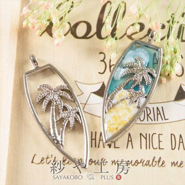 【内容詳細】レジン枠 サーフボード&ヤシの木 紗や工房オリジナル 48mm シルバー 1個 約4.8cm カン付き
