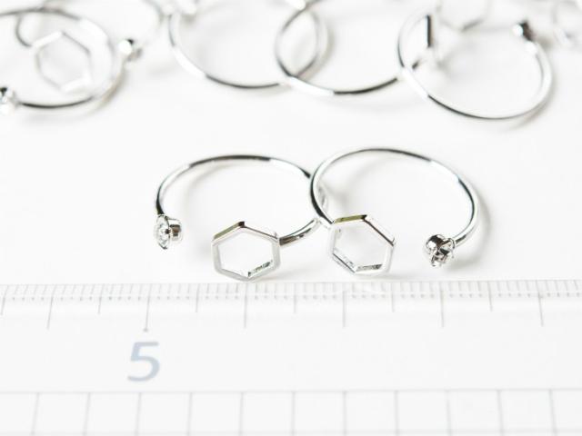 レジンフレーム付きリング真鍮製 ストーン&六角 シルバー 10個 指輪金具 フォークリング フリーサイズ 空枠 アクセサリーパーツ 華奢