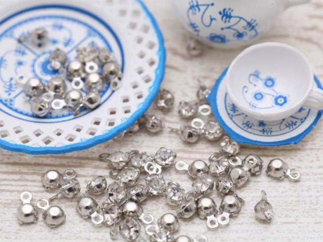 ラインストーンパーツ(約3mm)約50個 シルバーxクリスタル ラウンド カン付き 1穴 台付き フレームストーン 手芸材料 金属パーツ デコ