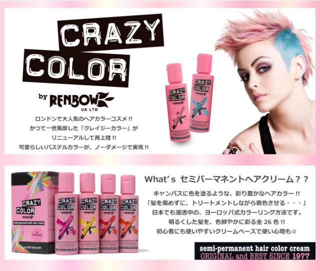 | ■ 商品説明 | 鮮やかなネオンカラーとの出会い!! ロンドン直輸入!!あのクレイジーカラーがリニューアルし日本に再上陸!! クレイジーカラーは、輝くレインボーカラーのへアマニキュアです。 シャンプー後にタオルドライした髪の染めたい部分に塗布し髪へもみこんだりコーミングすることでカラーの定着が促進します。 ラップを巻き自然放置10〜20分(加温の場合は5〜8分後クーリング5分前後)時間をおくことでカラーがはいります。 放置時間によりカラーの持続性がかわり、事前に髪を明るくしておくことでより綺麗に仕上がります。 品切れの際には、新入荷までに約1ヶ月程かかりますのでご了承ください。 | |||