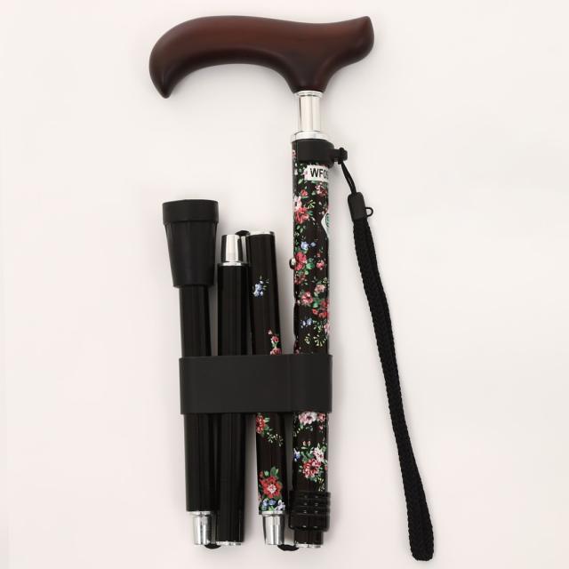 折りたたみ杖 女性用 夢ライフステッキ スリムネック折りたたみスリムタイプ(柄) ブラックフローラル 全長73.5〜83.5cm 婦人用・高齢者 ウェルファン