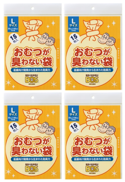 おむつが臭わない袋BOS 大人用 袋型 Lサイズ 15枚入 4袋セット クリロン化成 使い捨て メール便発送対象品 袋に入れて結ぶだけ!そのままポイ!