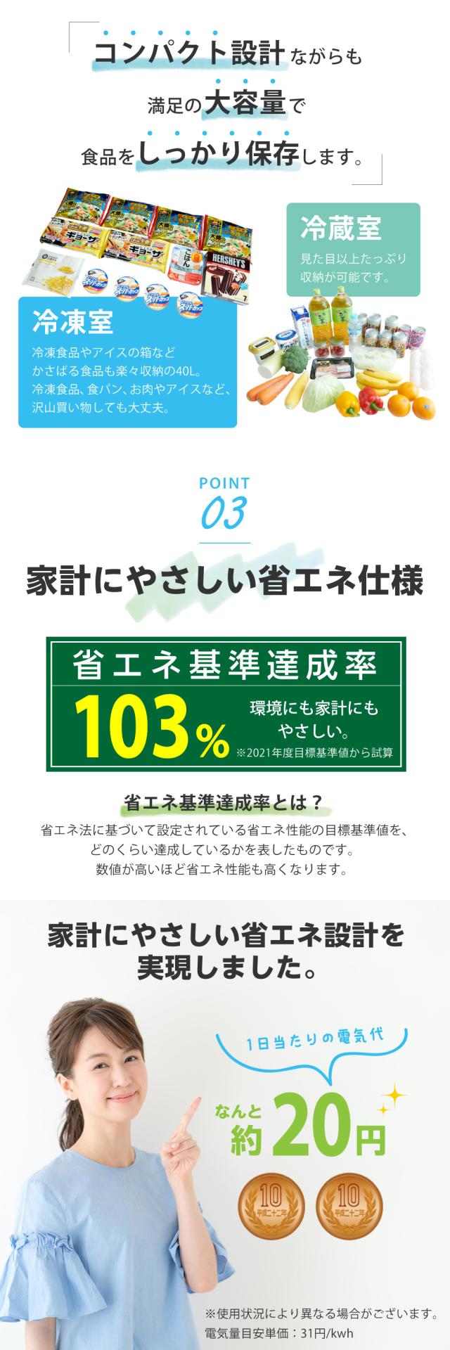 * 定格内容積: 138L(冷凍室: 40L 冷蔵室: 98L)