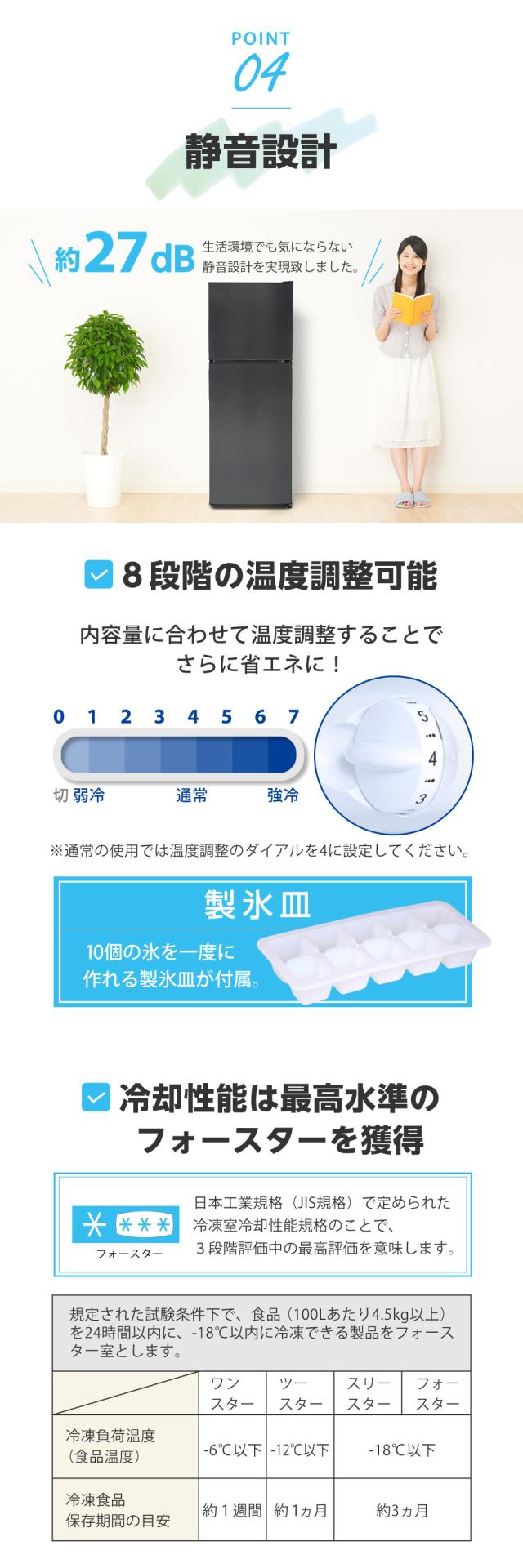 - 息子と二人住まいですが、丁度良い大きさでした。ドアポケットが三段あり、調味料が多い我が家では便利です。ただ、霜取り機能があると良かったのですが、この安さですので、贅沢はいえませんが。