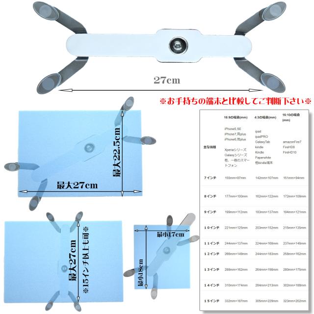 スマホ&タブレット装着部分は4.5〜27cm(通常のスマホサイズ〜15インチ)まで開きます。