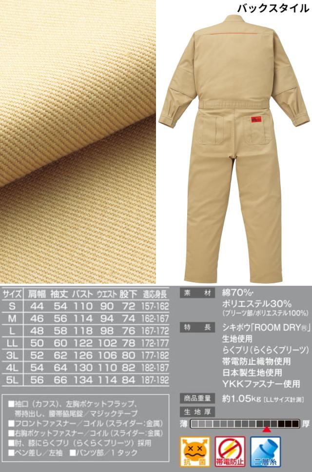 つなぎ服 1-1290 AUTO-BI 長袖 帯電防止 抗菌 日本製生地 らくプリ ツナギ 山田辰 作業服 作業着 オールシーズン 4L-5L