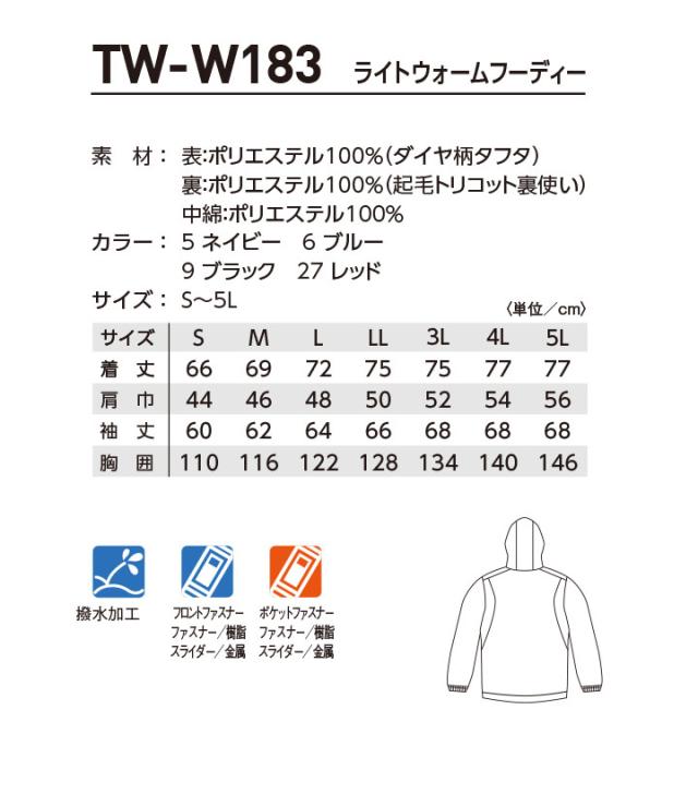 ライトウォームフーディ TW-W183 タカヤ商事 ジャケット ベーシック フード付き 長袖 撥水 軽量 保温 防寒着 防寒服 作業服 作業着 4L-5L