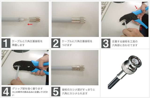 ストッパーを開いて、コネクタに同軸ケーブルがしっかりと差し込まれて固定してから圧着します。*説明書を求める方は、商品画像にある説明書を印刷してご使用ください。
