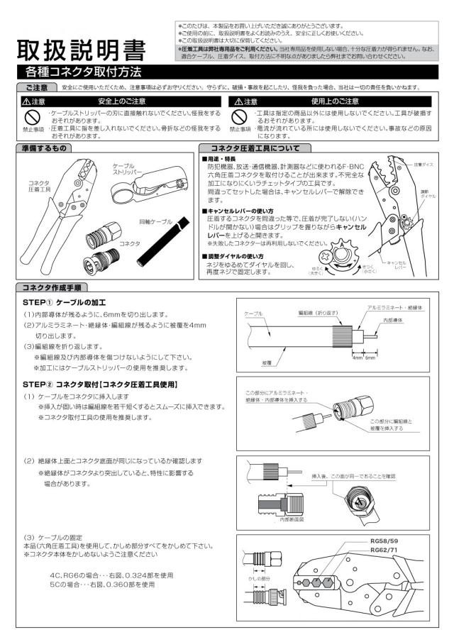 ストッパーを開いて、コネクタに同軸ケーブルがしっかりと差し込まれて固定してから圧着します。*説明書を求める方は、商品画像にある説明書を印刷してご使用ください。