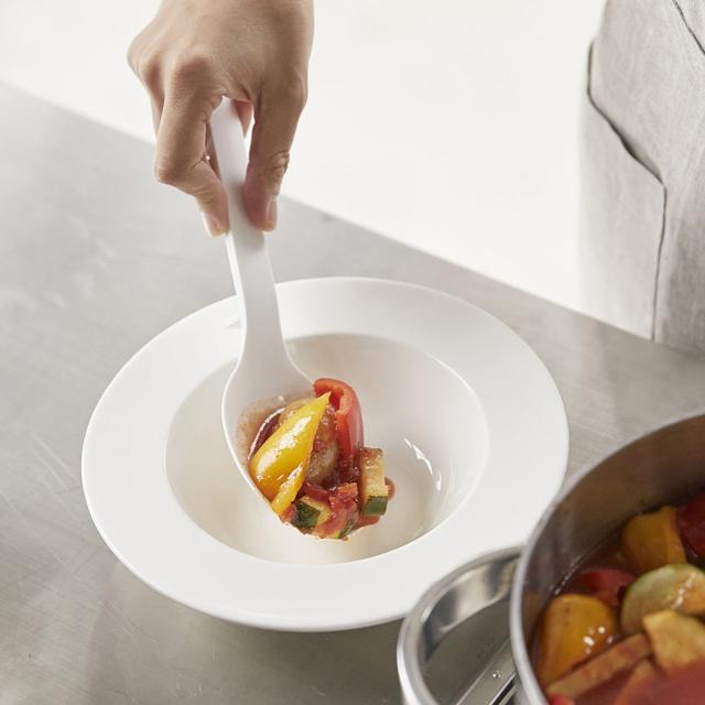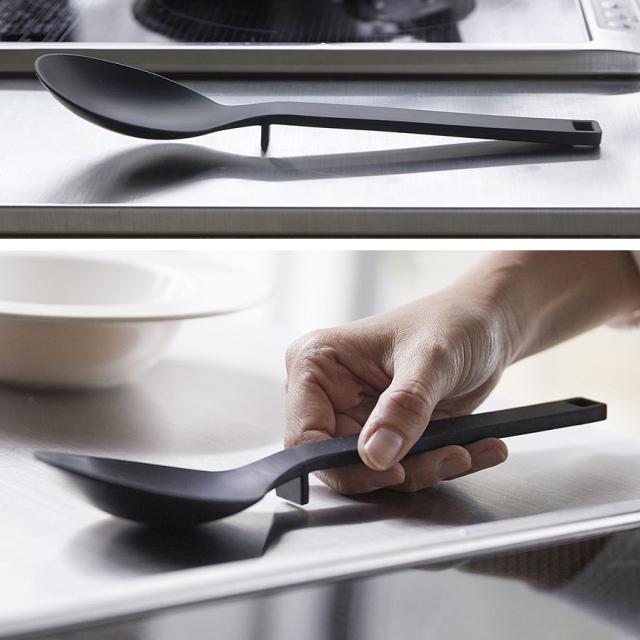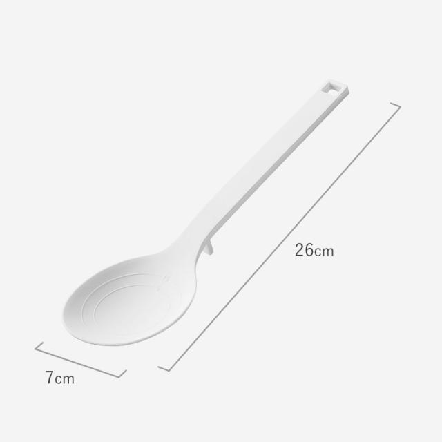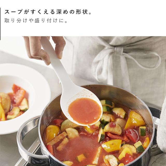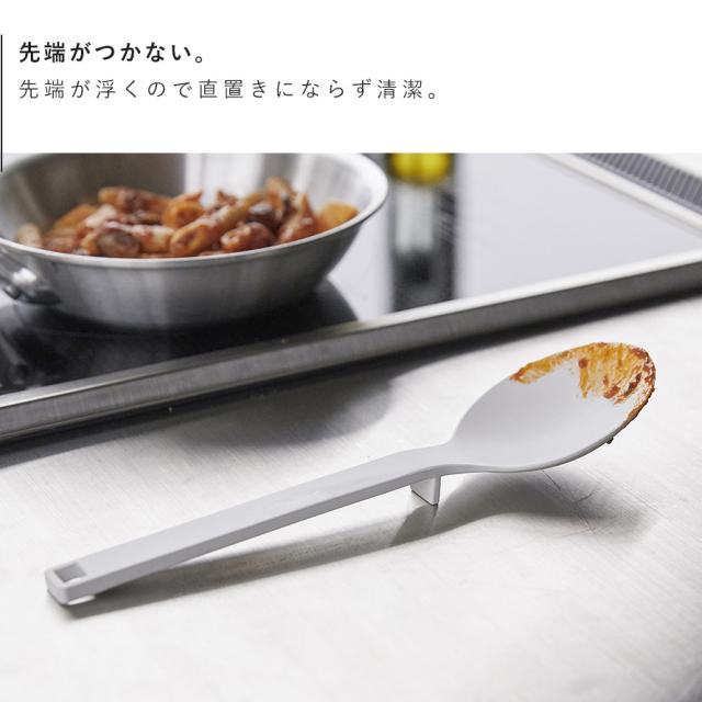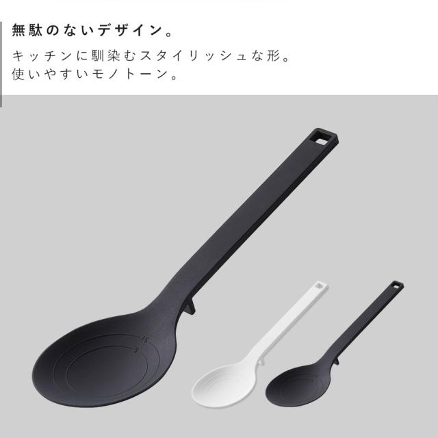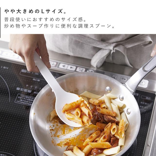 シリコーン製で滑りにくく、熱に強く、弾力性に優れ、ボウルやナベ、フライパンなどを傷つけない調理スプーン。普段使いにちょうどいい、やや大きめ26cmのLサイズ。