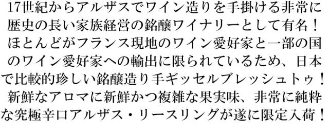 17世紀からアルザスでワイン造りを手掛ける非常に歴史の長い家族経営の銘醸ワイナリーとして有名!ほとんどがフランス現地のワイン愛好家と一部の国のワイン愛好家への輸出に限られているため、日本で比較的珍しい銘醸造り手ギッセルブレッシュトゥ!新鮮なアロマに新鮮かつ複雑な果実味、非常に純粋な究極辛口アルザス・リースリングが遂に限定入荷!