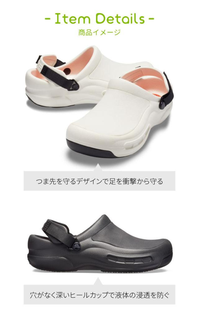 従来のビストロ同様、革新的なcrocs lockを使用し、水・油などで濡れた床でも摩擦力の強いソールで滑りにくい構造となっています。穴の空いていない厚みのあるアッパーで液体の侵入を防ぎ、安全性も◎