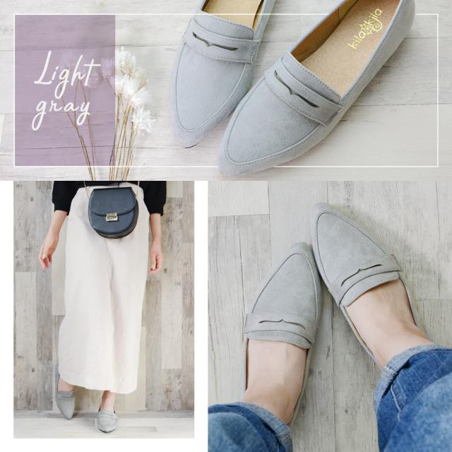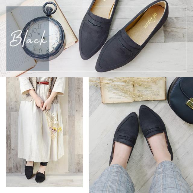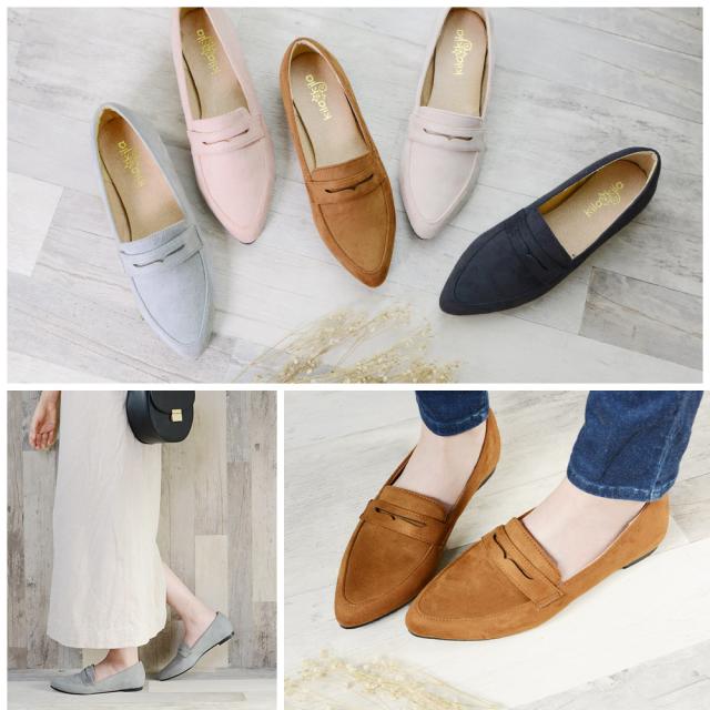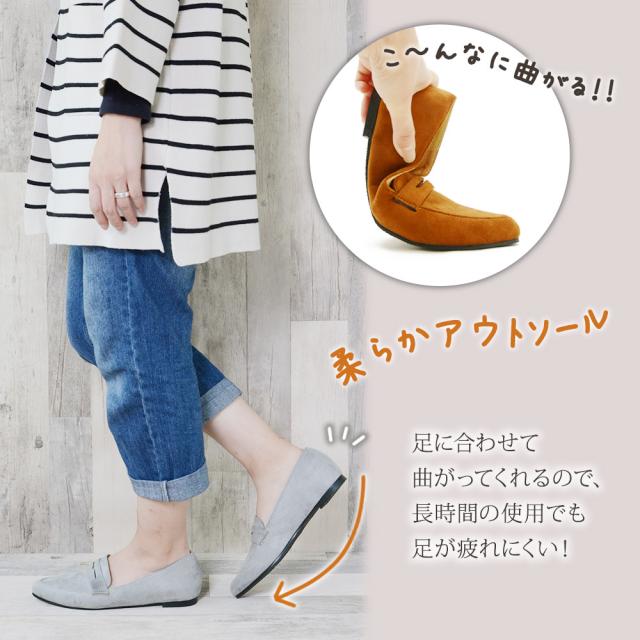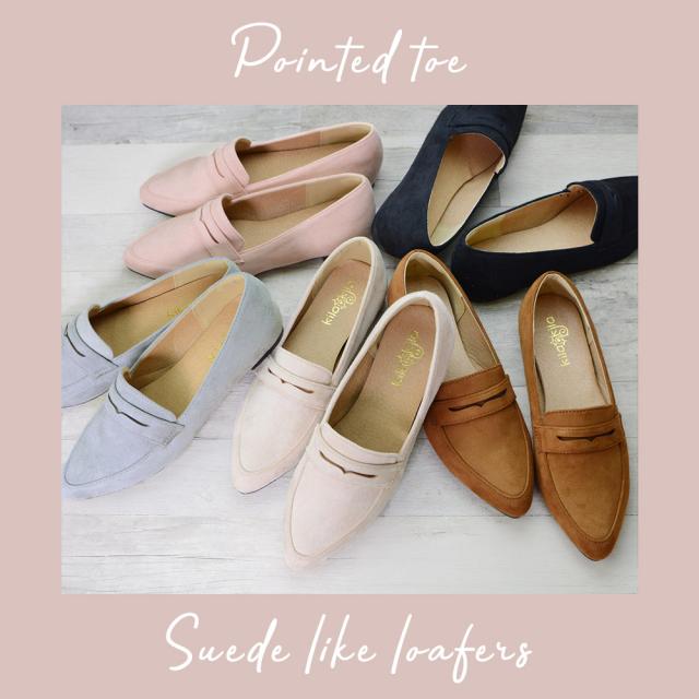 スエード調で大人なカジュアルスタイルに♪ローファーデザインのとんがりパンプス!カジュアルだけじゃなくフェミニンや色々なコーデにも相性◎足元をスッキリ見せることができるポインテッドトゥはいつものスタイルに女性らしさをプラスしてくれます♪インソールは足に負担がかかりにくい低反発風の0.5cmの肉厚クッションでふわモチ♪屈曲性に優れたやわらかアウトソールで足馴染み◎ゴム底アウトソール使用で滑りにくくしっかり歩行をサポートしてくれます。