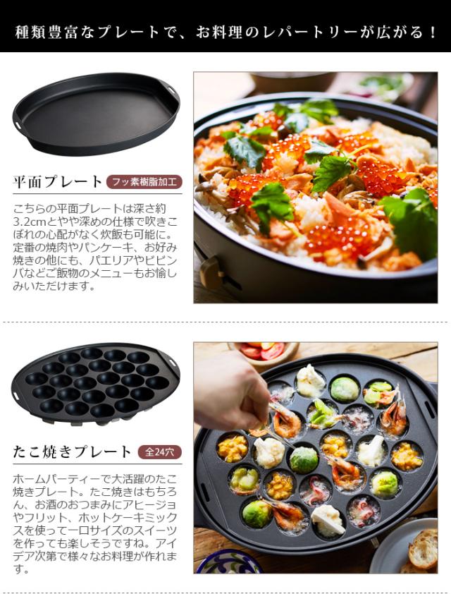 平面プレートの他にたこ焼きプレートと深鍋付き。これ一台で焼肉、餃子、パンケーキ、お好み焼き、たこ焼きと、様々なレシピに対応してくれます。深鍋は直火調理OKなのでキッチンコンロで下準備をしてから、食卓であたたかい料理を囲むこともできます。
