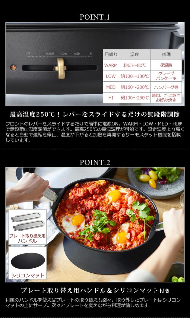 ■ご注意…工場出荷時にはフタの取っ手が内側に取り付けてあります。プラスドライバー(別売り)でネジを外し外側に取り付けてからご使用ください。/プレートは高温になります。火傷には充分ご注意して下さい。/本体は壁やコーナー等から20cm以上離してご使用下さい。/はじめてお使いになる際は、プレートを台所用中性洗剤を含ませた柔らかいスポンジ等で洗い、よく水ですすぎ洗いし、十分に乾かしてからご使用下さい。