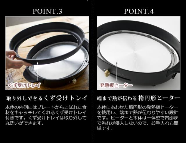 「毎日にちょっとゆとりを。暮らしをもっとゆたかに。」をコンセプトにした、BRUNOの新シリーズ「BRUNO crassy+」から「オーバルホットプレート」の登場です。オリジナルのオーバル形のフォルムがとてもスタイリッシュ。シックなカラーとシボ加工の質感でオシャレな鋳物ホーローをイメージするデザインに仕上がっています。のんびりした休日の食卓はもちろん、パーティ料理や特別なおもてなしの日まで、使うのが楽しみになりそうなホットプレートです。オーバルホットプレートは見た目だけではなく「使いやすさ」へのこだわりから機能面も充実しています。本体とプレートの隙間に落ちた食材をキャッチしてくれる、くず受けトレイ付きでお手入れも簡単。付属のハンドルを使えば、プレートの取り替えも楽々できます。テーブルで次々と調理できるので、ホストもゲストと一緒にお食事を愉しむことができます。