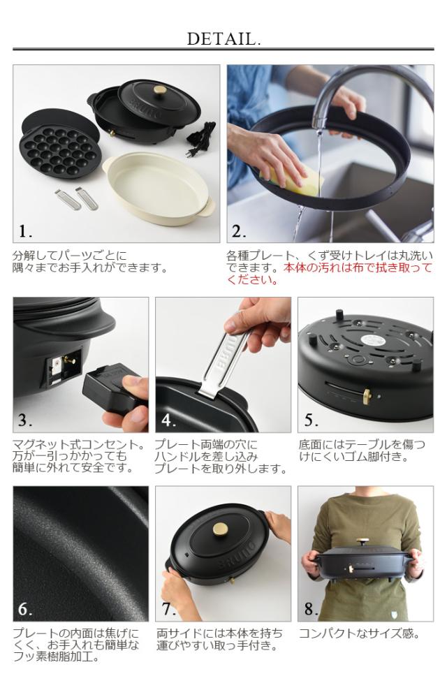 ■素材…本体:スチール、フェノール樹脂/平面プレート、たこ焼きプレート:アルミニウム合金(内面フッ素樹脂塗膜加工)/深鍋:アルミニウム合金(内面セラミックコート、外面フッ素樹脂塗膜加工)/くず受けトレイ:スチール/プレート取り替え用ハンドル:ステンレス鋼