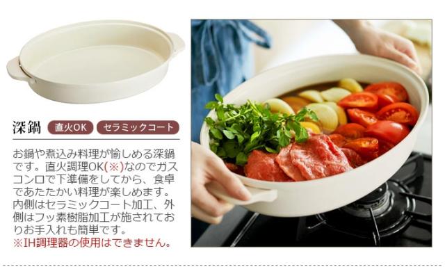 ■深鍋について…深鍋は直接ガスコンロ・電熱コンロにかけて直火調理可能※IH調理器は使用不可/限度量(約2L)を超える具材を入れないでください。/ご使用の火力によっては鍋の劣化のおそれがあるので、長時間の直火使用はしないでください。/直火で調理することで鍋底面に焼け跡が付きます。