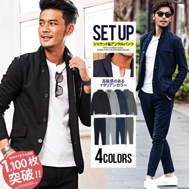 【送料無料】セットアップ メンズ 上下 SET UP カジュアルスーツ カルゼ テーラードジャケット イタリアンカラー ボトムス アンクルパンツ スラックス 無地 細身 スリム ブラック ネイビー グレー 黒 紺 M L Vicci ビッチ 即日発送 [VIJP18-02]