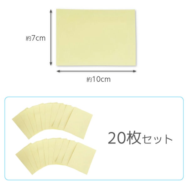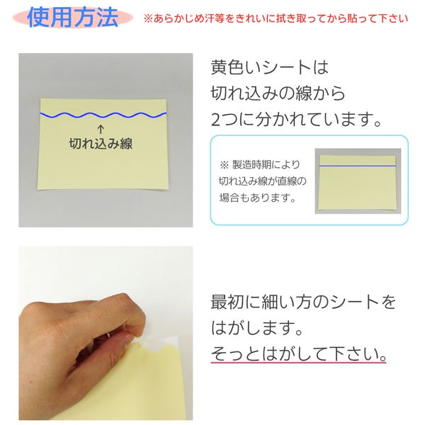 ■商品詳細 ■商品名 わき汗フィルム(20枚入り) ■サイズ ・10cm×7cm ■内容 ・フィルム:20枚 ◆使用方法 1.黄色いシートの細い方をそっとはがします。 2.はがした粘着面を貼りたい位置にしっかり貼り付け、残りの黄色のシートを少しずつはがしながら肌に貼っていきます。 3.白いシートをはがします。 ■材質 フィルム部:ポリウレタン、アクリル系粘着剤 ■注意事項 ・最初に汗をよく拭きとってからご使用下さい。 ・本来の用途以外には使用しないでください。 ・お肌に異常がある場合はご使用をおやめください。 ・かぶれ等が生じた時は、速やかにご使用を中止して下さい。 ・ムダ毛の処理を行わず本品を使用しないで下さい。 ・フィルムをはがす際はゆっくりとはがして下さい。 ・製造時期により仕様が若干異なる場合があります ■SEARCH WORD 脇 ワキ 汗 発汗 防臭 防汗 シール 汗染み 保護 シート 防水 夏 緊張 ポイント 送料 無料 レディース メンズ 男性 女性 透明 |