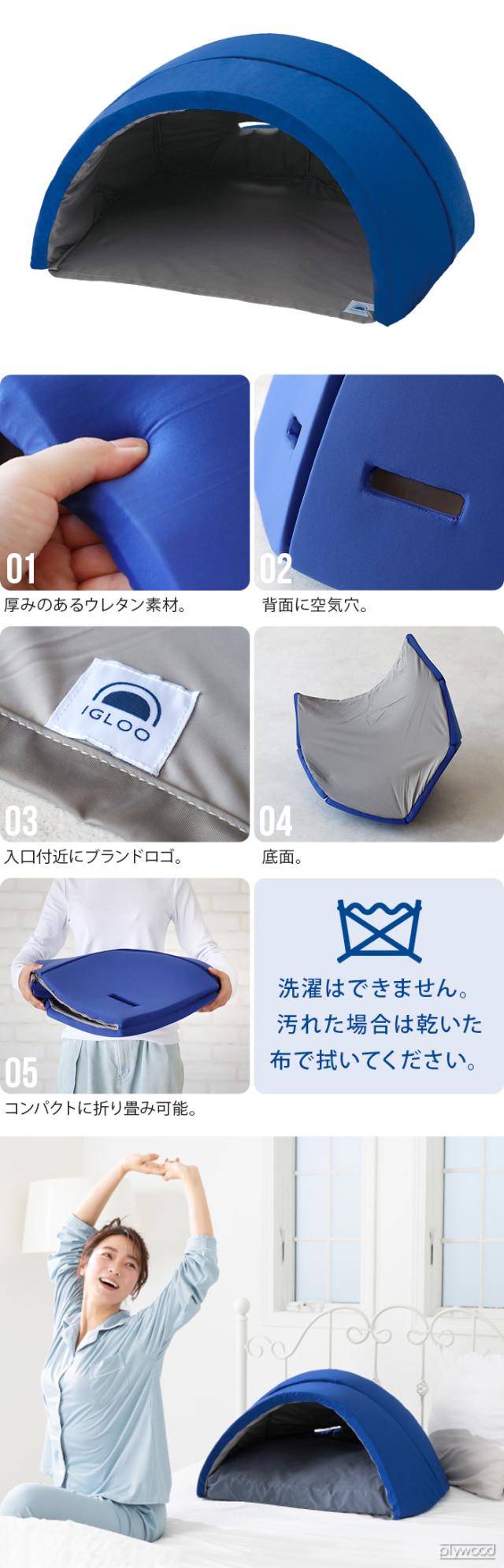 布団に入ってからなかなか寝付けない、朝方や夜勤明け時にカーテンから漏れる光が気になる等の悩みを解決する快眠まくら「IGLOO(イグルー)」のご紹介です。眠りの専門医と共同開発し、快適に眠るうえで必要な3大要素「遮光」「適度な閉鎖感」「周囲の音の軽減」をおさえたドーム型のデザインです。普段使っているまくらを中に入れてかぶることで顔周りを覆われ、落ち着いた環境で眠ることが可能。スムーズな寝つきをサポートしてくれます。