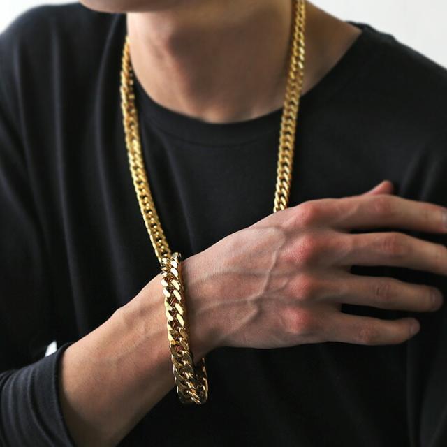 B系スタイルには欠かせない王道アクセ、喜平デザインのブレスレット。光沢のある4面カットの太め幅で、高級感も出しつつ手首で圧倒的な存在感を発揮します。1本で着けるのはもちろん、重ね付けにも。大きめサイズなのでルーズに着けるのがオススメです。