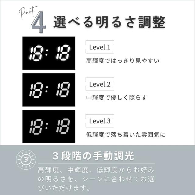 ・就寝モード(5段階の自動調光):主に寝室でご使用いただくのに最適です。電気を消すと周囲の明るさに合わせて5段階の輝度レベルでライトダウンします。最低輝度になると、【:】の点滅が止まります。