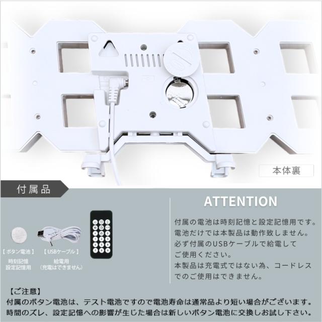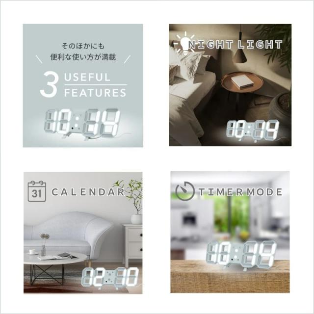 12H/24H表示、日付表示、USB電源、温度表示、就寝モード(5段階の自動調光)、オート調光(4段階の自動調光)、4段階の手動調光、3種類のアラーム設定、スヌーズ設定、カウントダウン、カウントアップ、時計表示ON/OFF