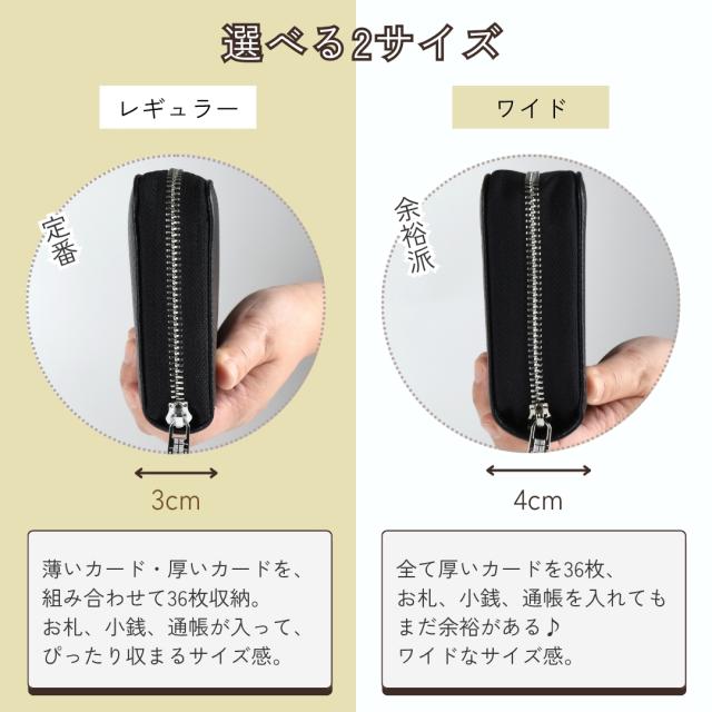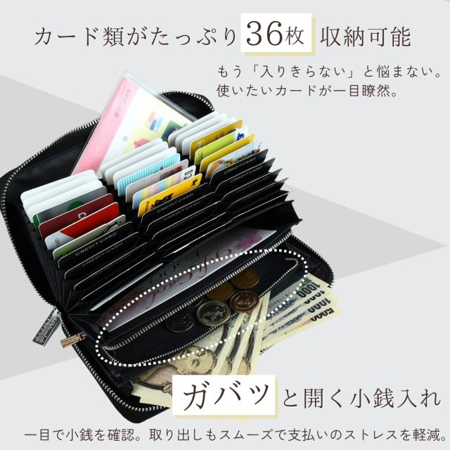 スキミング防止機能付き、ファスナー開閉、カード36枚収納
