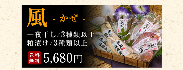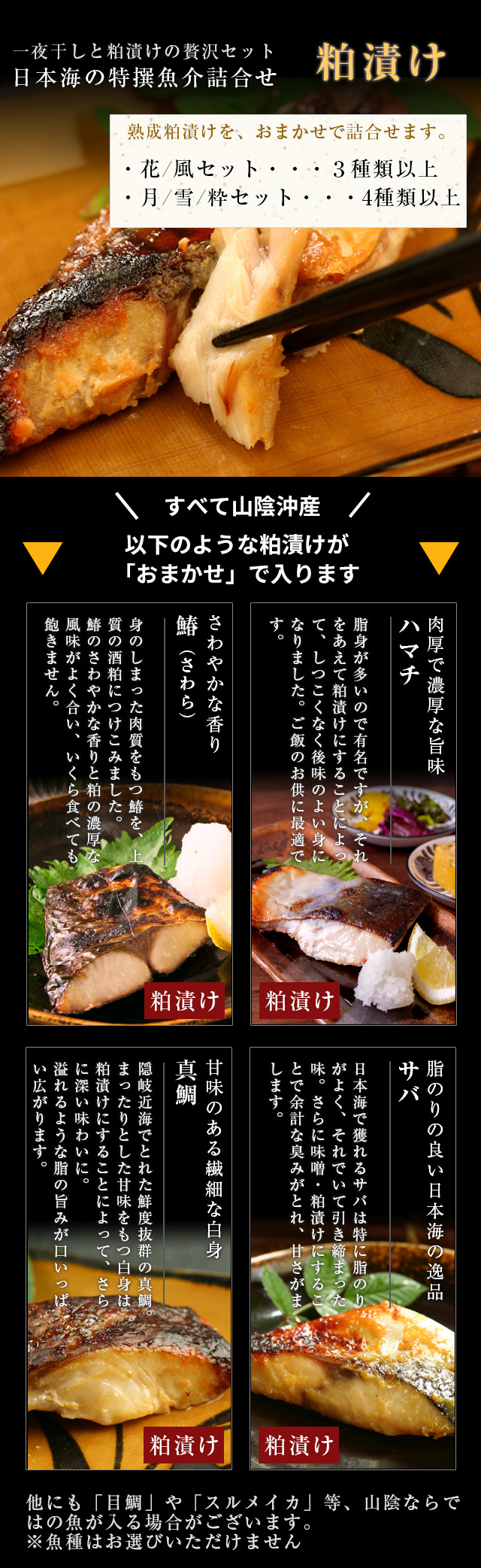 | 内容量 | 【一夜干し】4種類以上 【粕漬け】4種類以上 |