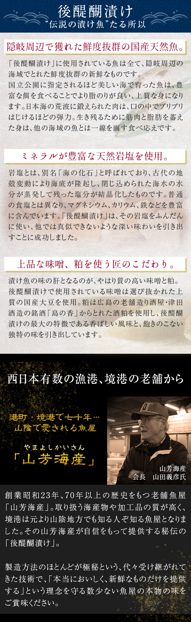島根県隠岐近海でとれた天然魚を使った伝説の漬け魚「後醍醐漬け」。伝統製法による趣深い味わい。1切づつ便利な個包装になっています。 [父の日 母の日 敬老の日 お歳暮 お中元 ギフト プレゼント]