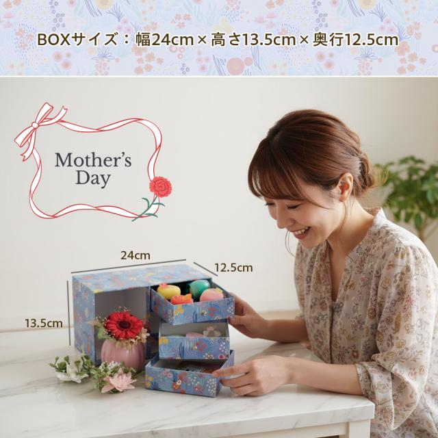 枯れないお花のプリザーブドフラワーと日本三大菓子処「松江」の伝統文化を受け継ぐ上生菓子、半生菓子、桜煎茶を和洋折衷の箪笥(たんす)箱に詰めました。華やいだひとときを演出する逸品で、日ごろの感謝をお届けします。