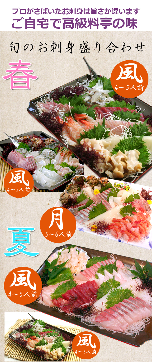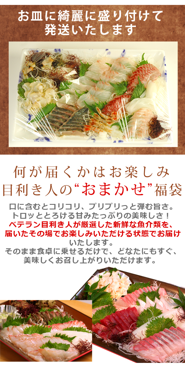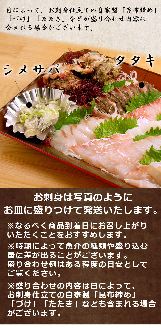 プロがさばいてお皿にきれいに盛り付けました。届いたその場ですぐにお召し上がりいただけるよう、お刺身の盛り合わせの状態でお届けします。※鮮度保持の観点から、北海道・東北・沖縄及び離島、また、午前中着ご指定の場合の関東・中部など、配送に2日以上かかる地域へのお届けはお受けいたしかねます。