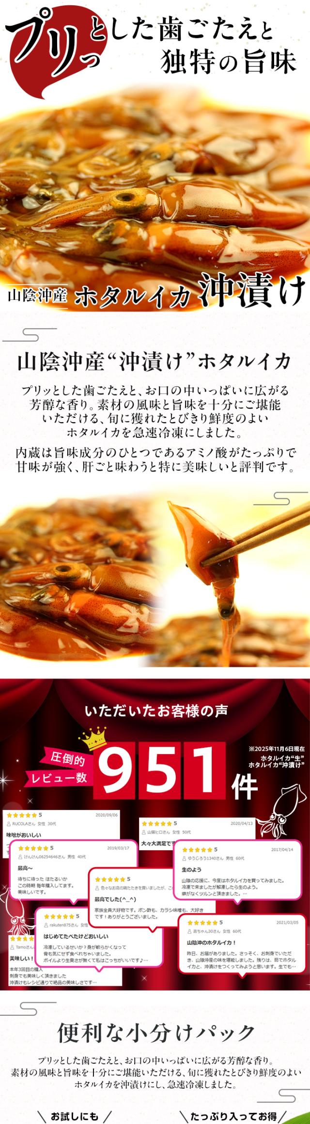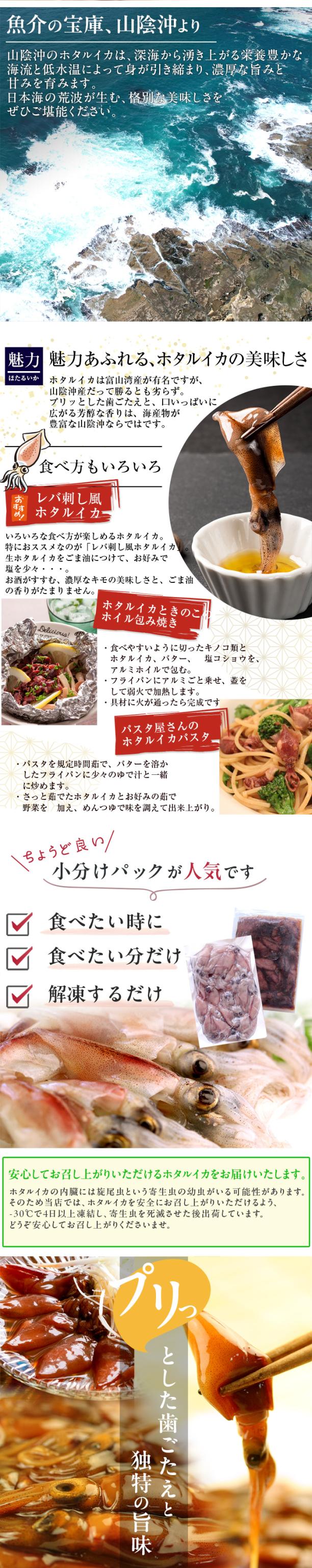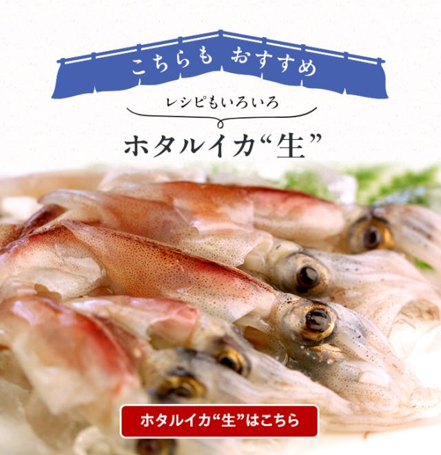 | 産地名 | ホタルイカ(日本海産)、たれ(しょうゆ、砂糖、かつお合わせだし、みりん、生姜、食塩)、(一部に小麦・大豆・サバ・イカを含む) |