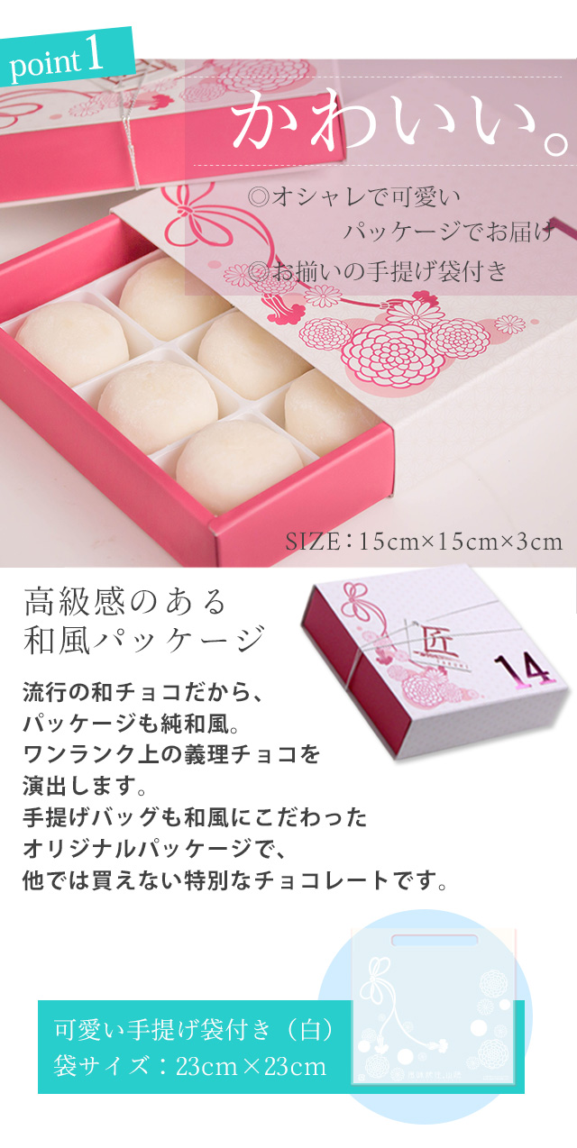 毎年脅威の販売個数を記録している定番の「しょこら餅」。ぷるんぷるんのおもちでたっぷりのとろ〜りホワイト生チョコレートを包みました。和テイストのオリジナルケースに、そのまま渡せるデザインバッグ付き。会社・職場向け義理チョコの大量まとめ買いや友チョコなど、お配り用のバレンタインチョコにもおすすめ。[バレンタイン チョコ チョコレート2026 valentine 義理チョコ 本命チョコ 友チョコ 和チョコ 人気 職場 会社 かわいい おもしろ ギフト プレゼント]