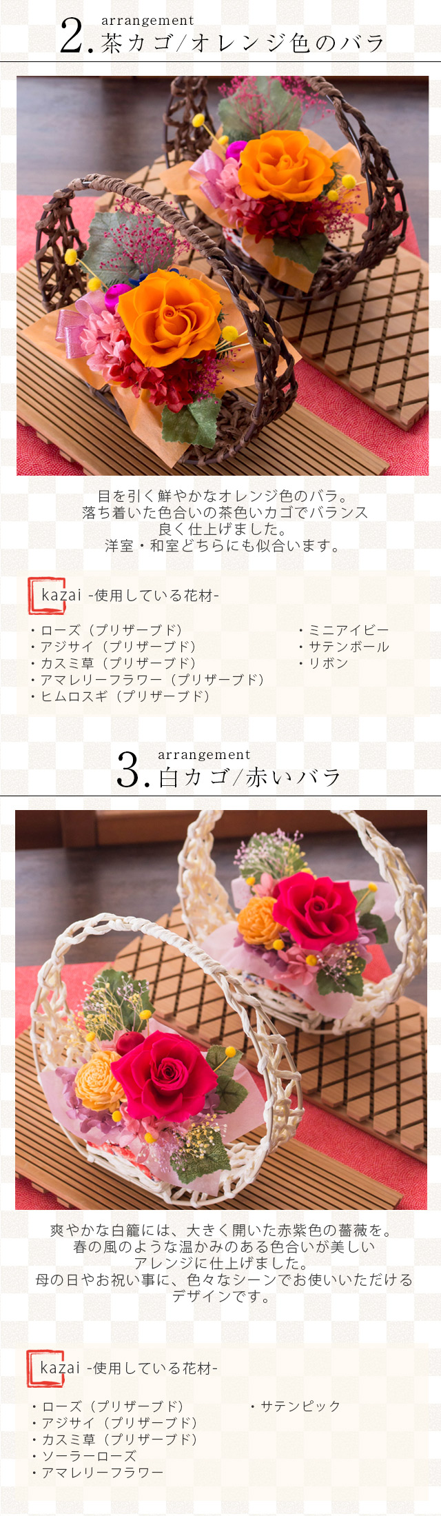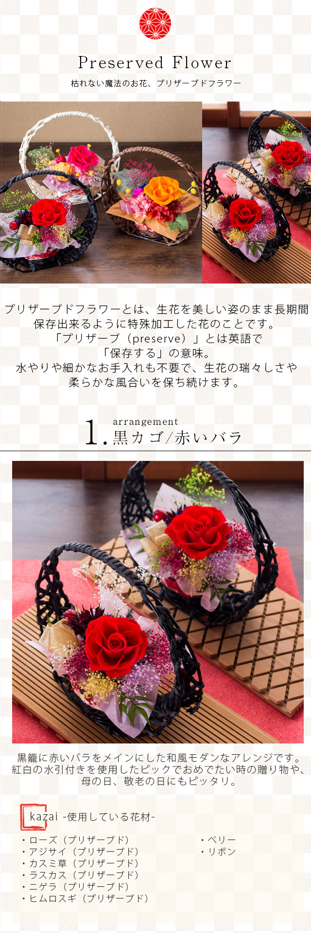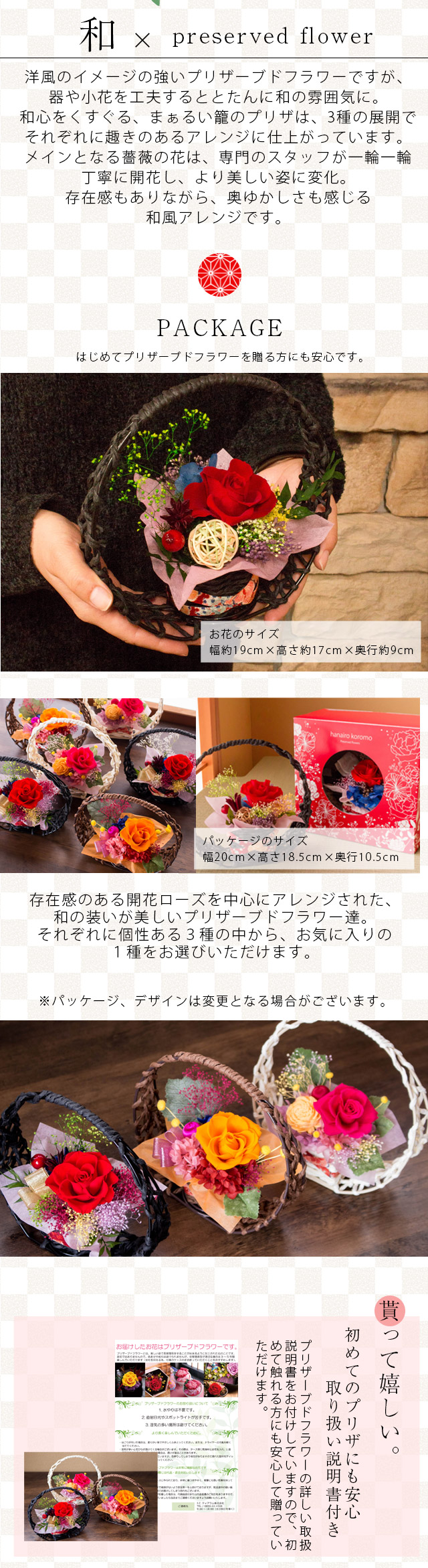 洋風のイメージの強いプリザーブドフラワーですが、器や小花を工夫するととたんに和の雰囲気に。和心をくすぐる、まぁるい籠のプリザは、3種の展開でそれぞれに趣きのあるアレンジに仕上がっています。メインとなる薔薇の花は、専門のスタッフが一輪一輪丁寧に開花し、より美しい姿に変化。存在感もありながら、奥ゆかしさも感じる和風アレンジです。