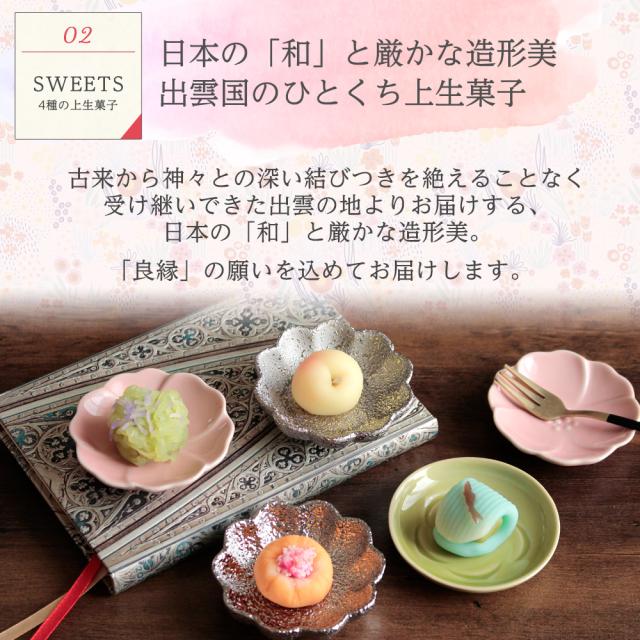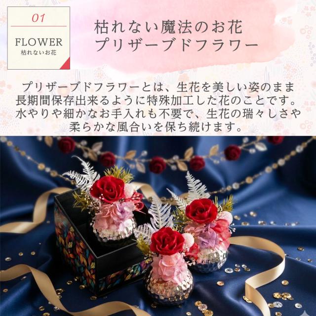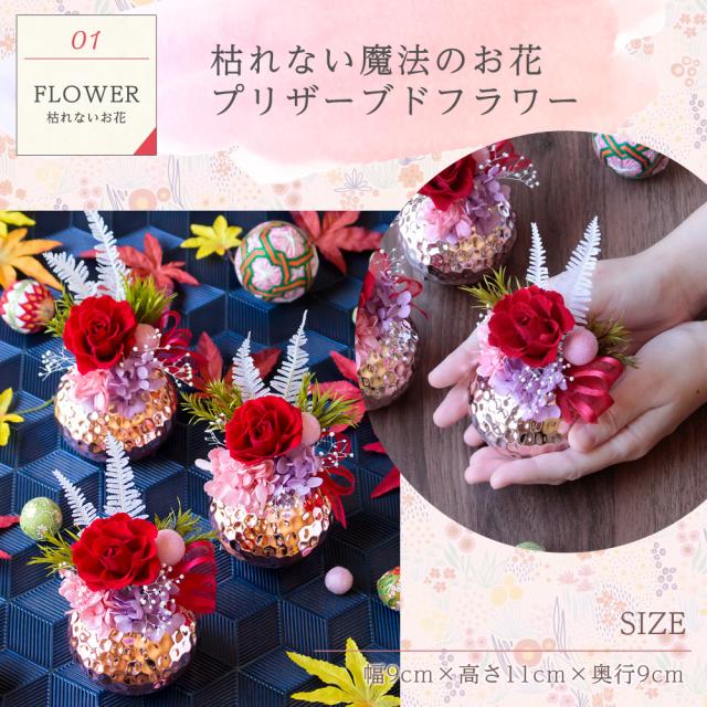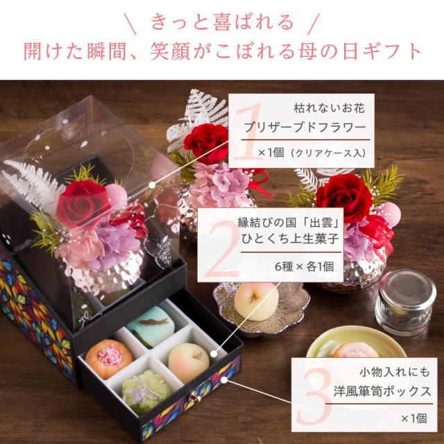 和洋折衷が美しい人気の母の日ギフト。金色の友禅に染められたクリアウィンドウ箪笥ボックスに、和風プリザーブドフラワーと出雲国の上生菓子をセットしました。見て良し・食べて良し・使って良しと色々楽しめるのが大きな魅力。大切な方への贈り物としておすすめです。
