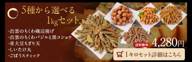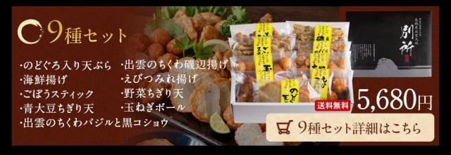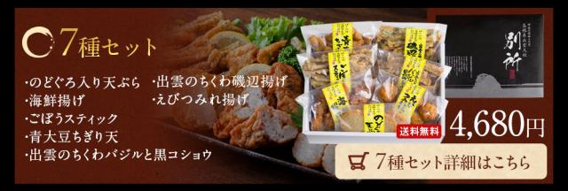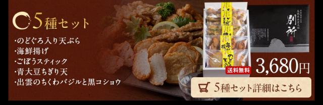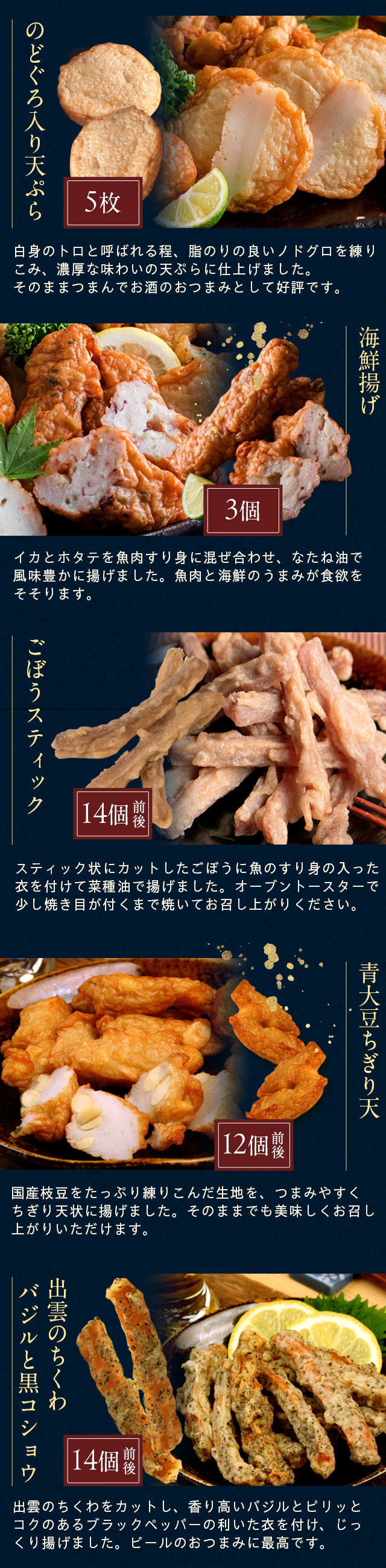 | 内容量 | 【のどぐろ入り天ぷら】100g(5枚入) 【海鮮揚げ】 100g(3個入) 【ごぼうスティック】100g(14個前後) 【青大豆ちぎり天】100g(12個前後) 【出雲のちくわバジルと黒コショウ】100g(8個前後) |