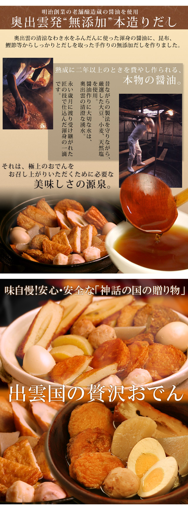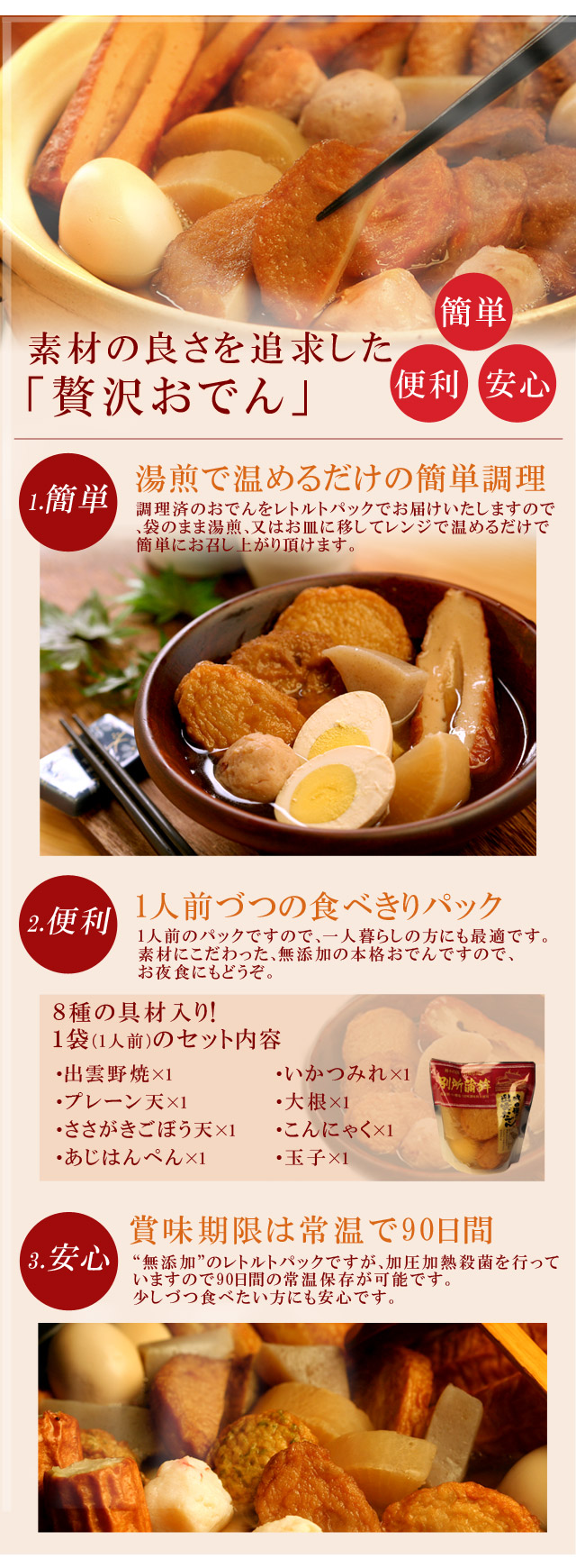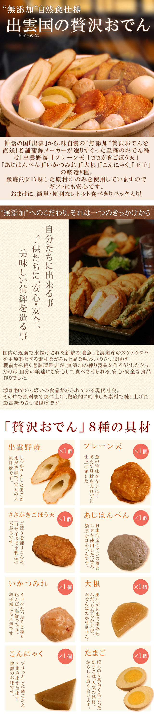 神話の国「出雲」から、味自慢の“無添加”贅沢おでんを直送!レトルトの食べきりパックで簡単・便利。徹底的に吟味した原材料のみを使用していますのでギフトにも安心です(「出雲野焼」「プレーン天」「ささがきごぼう天」「あじはんぺん」「いかつみれ」「大根」「こんにゃく」「玉子」の8種入り)。[お歳暮 お中元 父の日 母の日 敬老の日 ギフト プレゼント] =bsj=